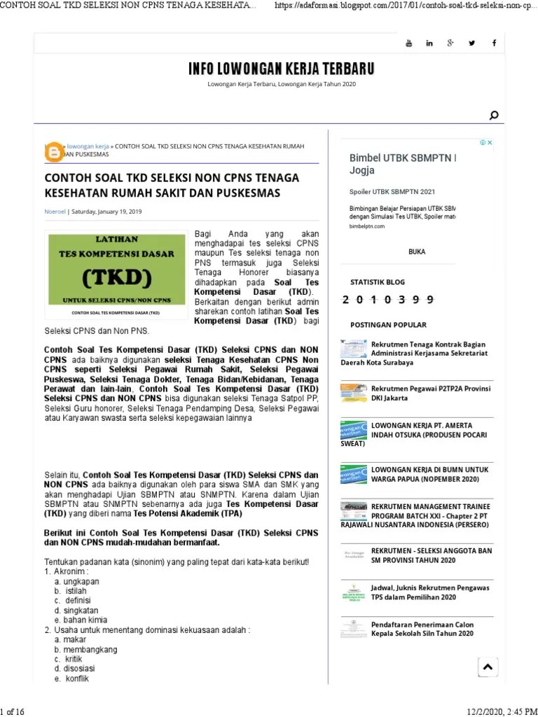 Lanjutan contoh soal latihan tes tertulis cpns ataupun calon tenaga honorer atau kontrak jabatan perawat (keperawatan) pada puskesmas, rumah sakit yang .